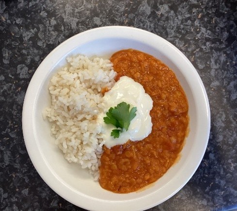 Serveres med fx ris eller bulgur, gerne en rest fra gårsdagens måltid, og yoghurt.