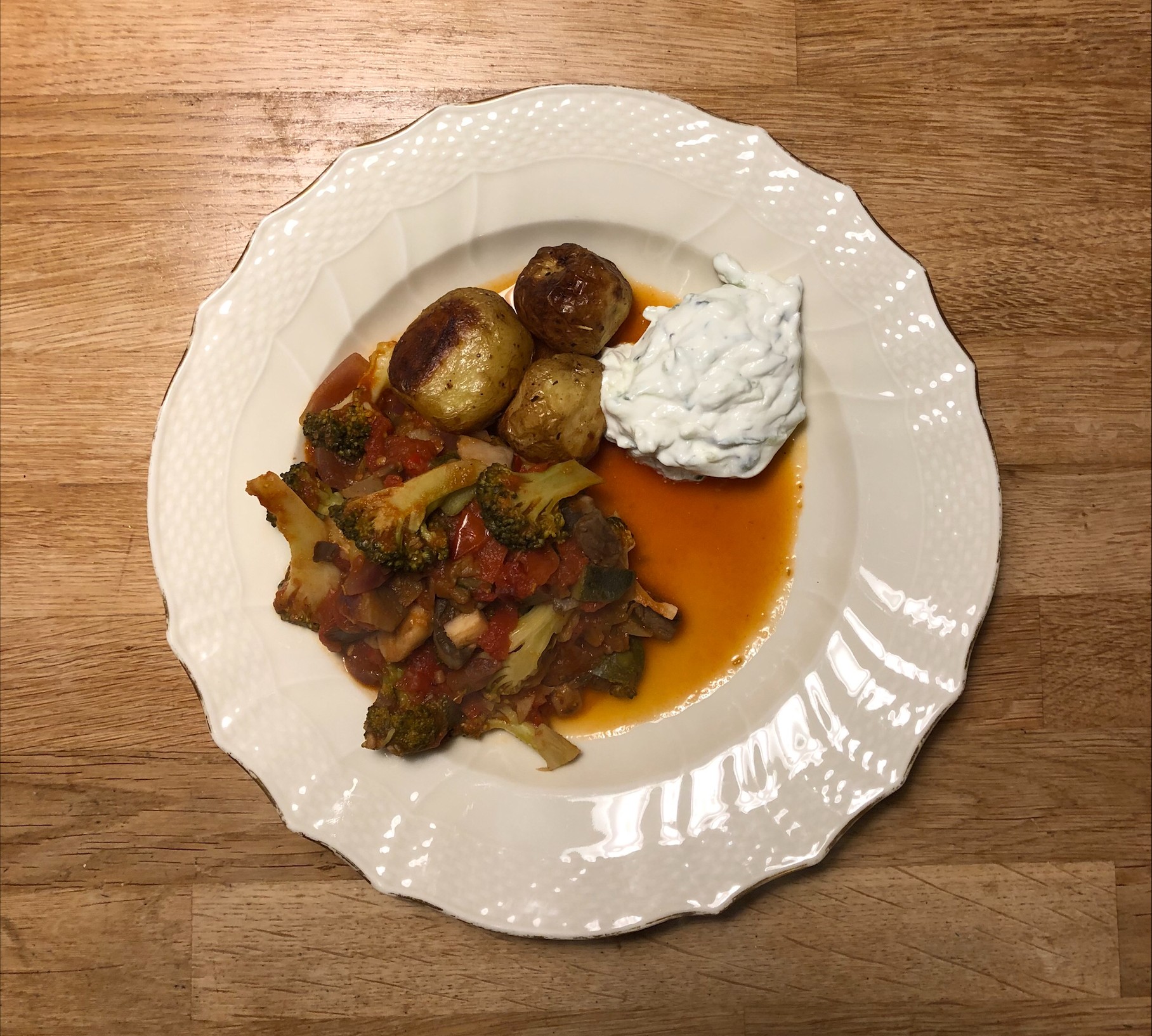 Servér retten med bagte kartofler, ris eller pasta og evt. tzatziki.