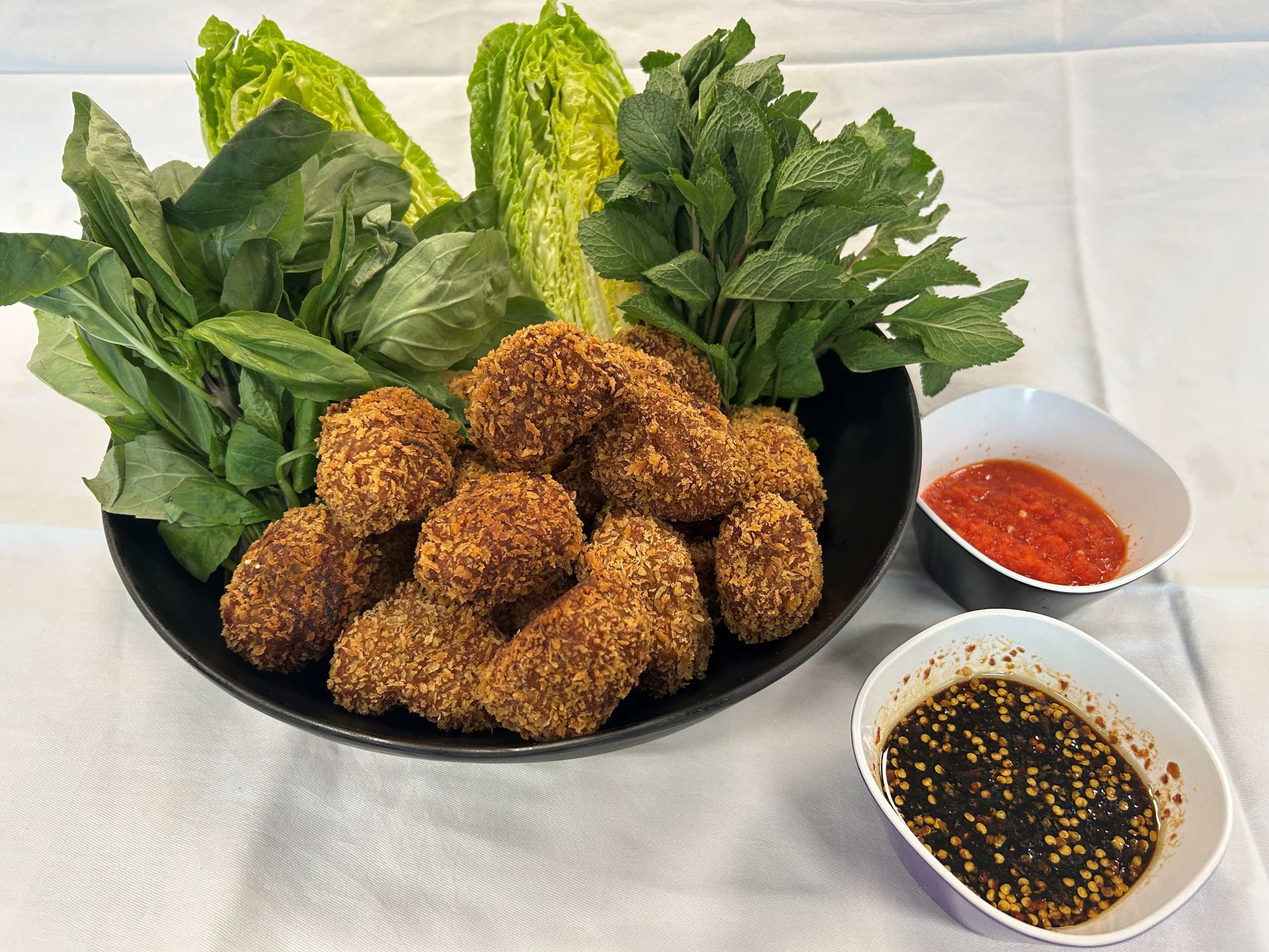 Servér dine nuggets varme med hjertesalat, thaibasilikum og/eller mynte og sød chilisauce eller hot ponzu dip.