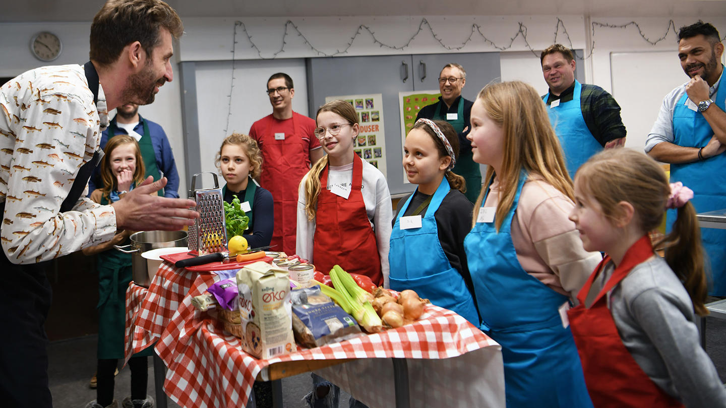 Hele familien kan være med, når vi tryller et måltid frem af mad i overskud og udforsker, hvordan man laver alt fra varm, hyggelig grøntsagssuppe til farverige dressinger med krydderurter – plus sprøde croutoner og rugbrødsstænger, som børnene elsker at knase på.