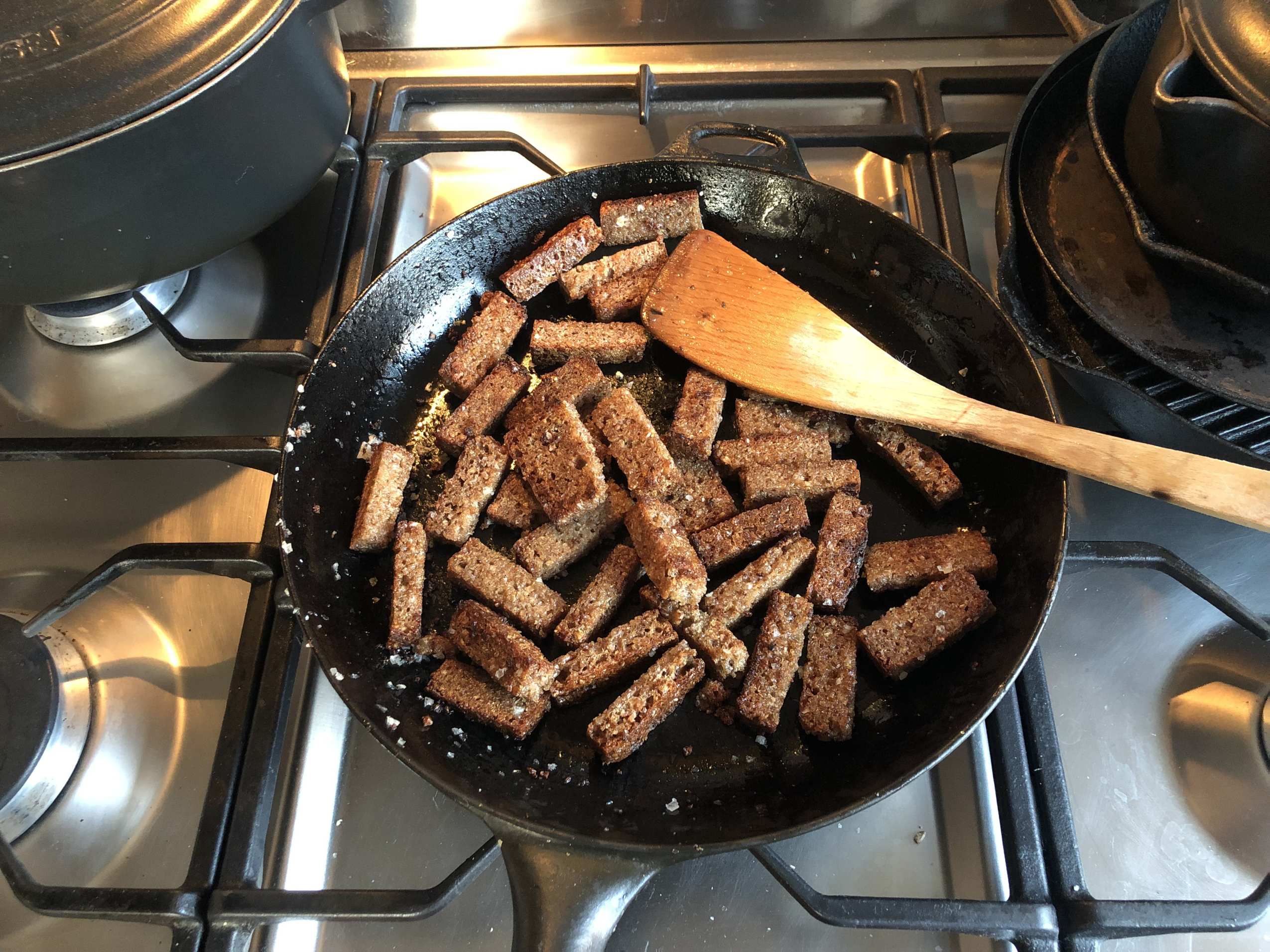 - Skær brødet i tern, kom olie og salt på og steg det på panden eller kom det i ovnen, så har du brødcroutoner til salater, supper eller som snacks.
